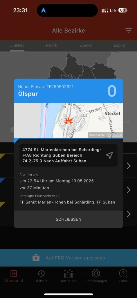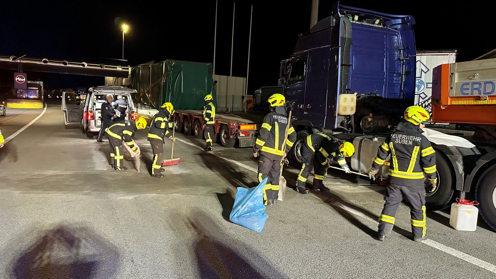 Die FF-Suben wurde gemeinsam mit der FF-St. Marienkirchen/Schärding zu einem Einsatz "Ölspur/Ölaustritt" gegen 22:54 Uhr gerufen. Einsatzort war die A8 Fahrtrichtung Deutschland (A3) im Bereich Grenzübergang/Zollamt Suben. Die FF-Suben rückte zunächst mit einem Fahrzeug zur Einsatzstelle aus. Am Einsatzort angekommen wurde der Einsatzleiter gleich durch die bereits anwesende Autobahnpolizei über die Lage in Kenntnis gesetzt. Einsatzgrund war ein Dieseltank eines LKW der zu voll getankt war und beim abstellen überlief. Aufgrund der Überschaubarkeit des Einsatzaufwandes konnte die FF-St. Marienkirchen, welche mit 2 Fahrzeugen ausgerückt war wieder abgezogen werden. Das ausgetretene Betriebsmittel wurde mit Ölbindemittel und Ölbindefließ gebunden. Im Anschluss konnte die Fahrspur wieder durch die Polizei für den Verkehr freigegeben werden.