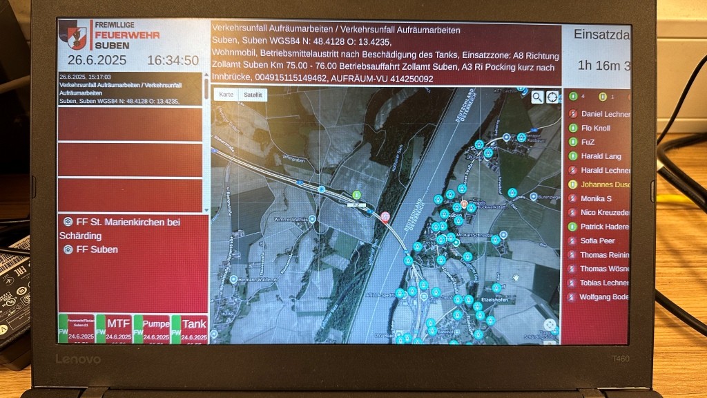 Die FF-Suben wurde gegen 15:17 Uhr gemeinsam mit der FF-St. Marienkirchen zu einem Verkehrsunfall/Aufräumarbeiten auf der A3 (Deutsche Autobahn) gerufen. Einsatzgrund war ein Metallteil, welches auf der Fahrbahn lag und beim überfahren nach oben geschleudert wurde. Dabei streifte es den Tank bzw. dessen Zuleitung so stark, dass Betriebsmittel ausfloss.