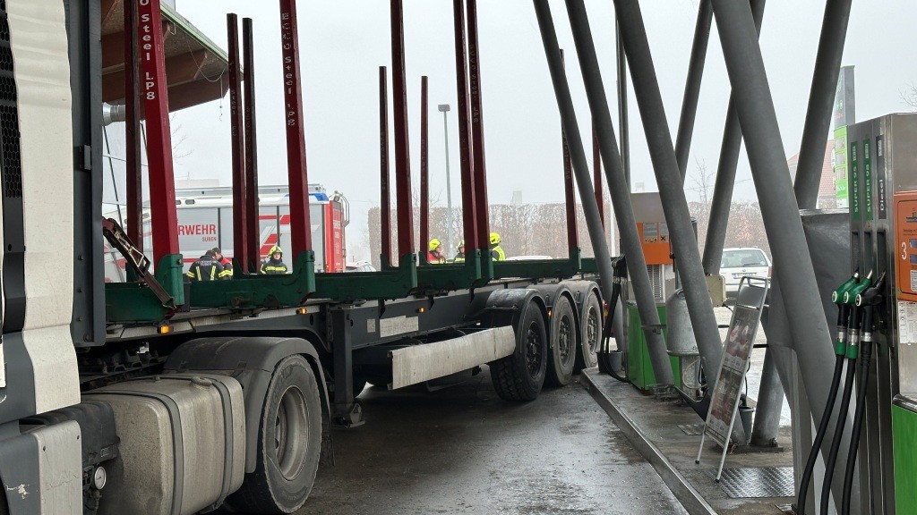 Einsatzgrund war ein LKW, welcher beim Wenden auf der Tankstelle aufgrund seiner Größe zahlreiche Gegenstände streifte und beinahe das Dach der Tankstelle einriss. Glücklicherweise konnte der Fahrer noch angehalten werden bevor noch größerer Schaden entstand. Nach dem Eintreffen der Feuerwehr wurde unter Leitung der Polizei das Fahrzeug durch den Fahrer behutsam zurückgesetzt. So konnte weiterer Schaden verhindert werden. Einsatzende gegen 13:30 Uhr im Feuerwehrhaus.
