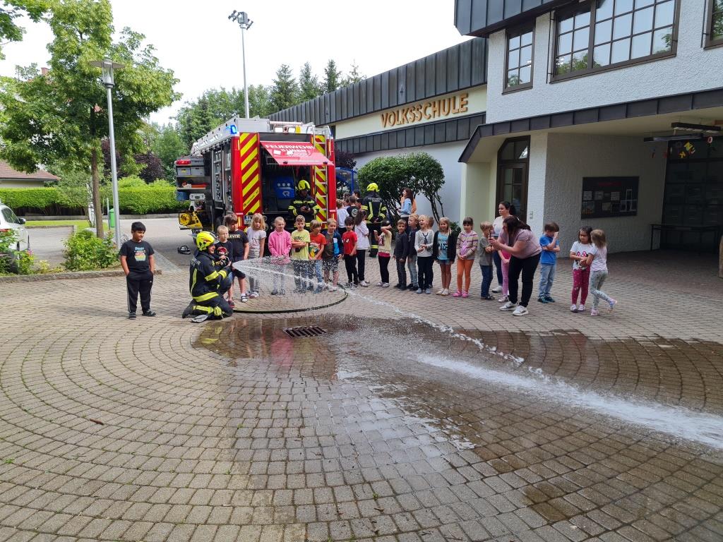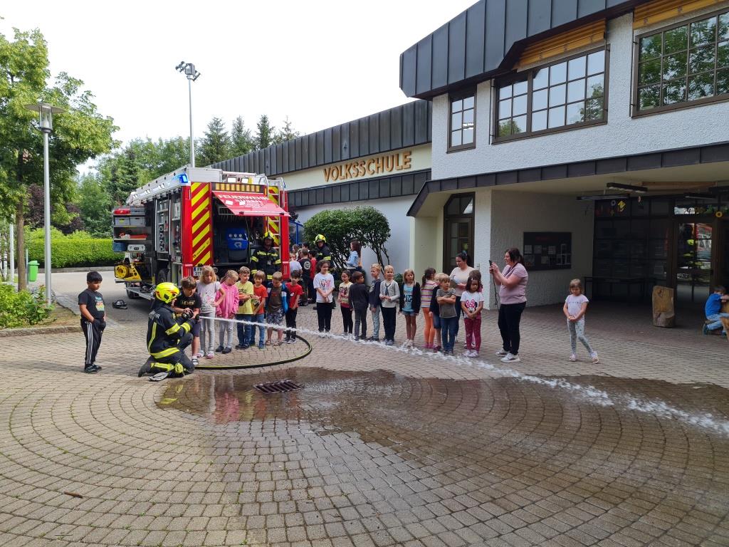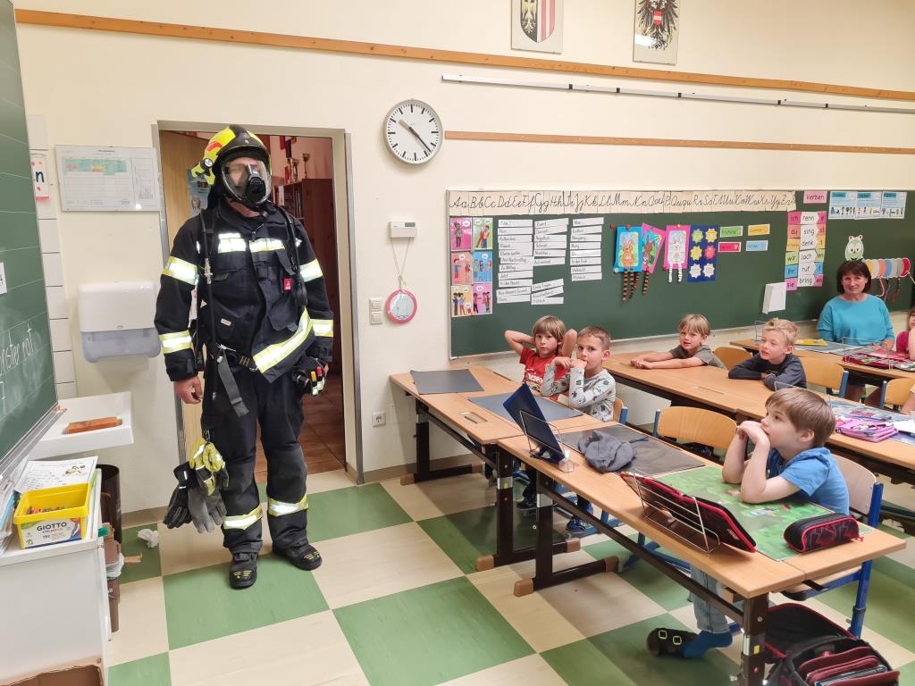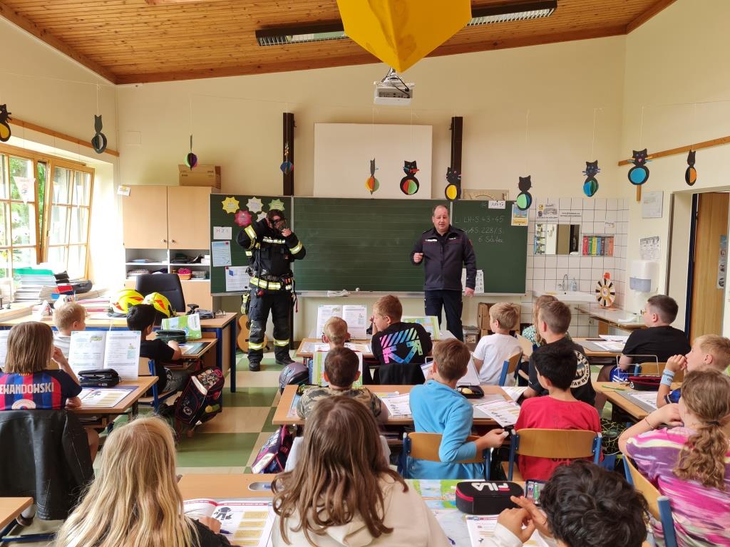 Um auch in der Örtlichen Volksschule das Verhalten bei Bränden zu üben wurde mit einer kleinen Mannschaft am Freitag eine Räumungsübung durchgeführt. Dabei wurde ein Feueralarm simuliert und der markierte Sammelplatz von den Kindern unter Begleitung der Klassenlehrer aufgesucht. Nach einer Überprüfung der Vollzähligkeit wurde den Kindern in mehreren Stationen das Feuerwehrauto und die Ausrüstung gezeigt. Im Anschluss wurde in der Klasse noch auf wichtige Punkte im Verhalten bei Brandfällen eingegangen. Ebenso wurde der Ablauf bei Bränden besprochen. Besonders wichtig - um den Kindern die Angst vor Einsatzkräften zu nehmen wurde ein Kamerad als Atemschutzträger vorgestellt.