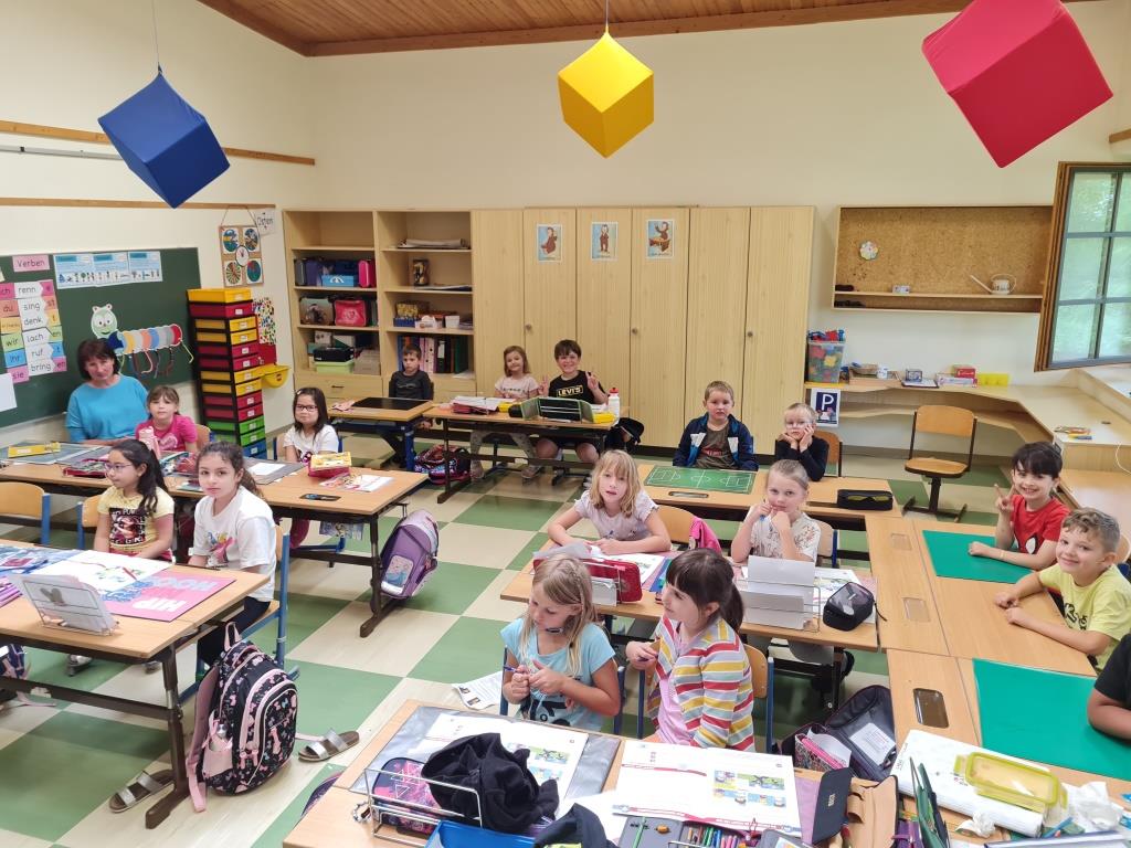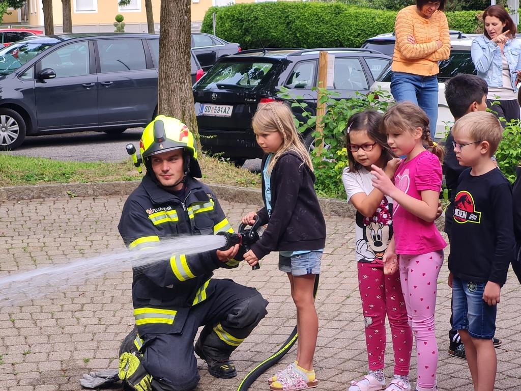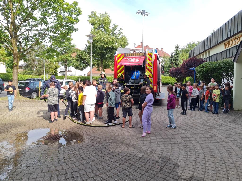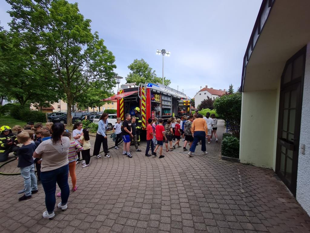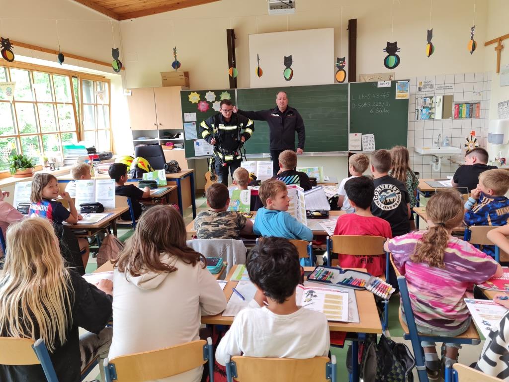 Um auch in der Örtlichen Volksschule das Verhalten bei Bränden zu üben wurde mit einer kleinen Mannschaft am Freitag eine Räumungsübung durchgeführt. Dabei wurde ein Feueralarm simuliert und der markierte Sammelplatz von den Kindern unter Begleitung der Klassenlehrer aufgesucht. Nach einer Überprüfung der Vollzähligkeit wurde den Kindern in mehreren Stationen das Feuerwehrauto und die Ausrüstung gezeigt. Im Anschluss wurde in der Klasse noch auf wichtige Punkte im Verhalten bei Brandfällen eingegangen. Ebenso wurde der Ablauf bei Bränden besprochen. Besonders wichtig - um den Kindern die Angst vor Einsatzkräften zu nehmen wurde ein Kamerad als Atemschutzträger vorgestellt.