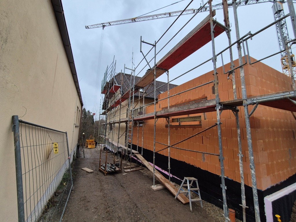 Nach und nach schreitet die Baustelle voran. Der Estrich im Keller wurde bereits in den letzten Wochen durch Eigenleistung entfernt. Die Baufirmen haben die Bentonarbeiten bereits abgeschlossen und die ersten Mauern hochgezogen. Auch das Gehölz für die ersten Teile des Dachstuhls wird durch die Kameraden der Feuerwehr vorbereitet und noch diese Woche montiert. Ziel ist es, die Anbauten und Dächer für den Winter entsprechend dicht zu machen, dass über die Kalte Jahreszeit im Inneren die Arbeiten fortgesetzt werden können.