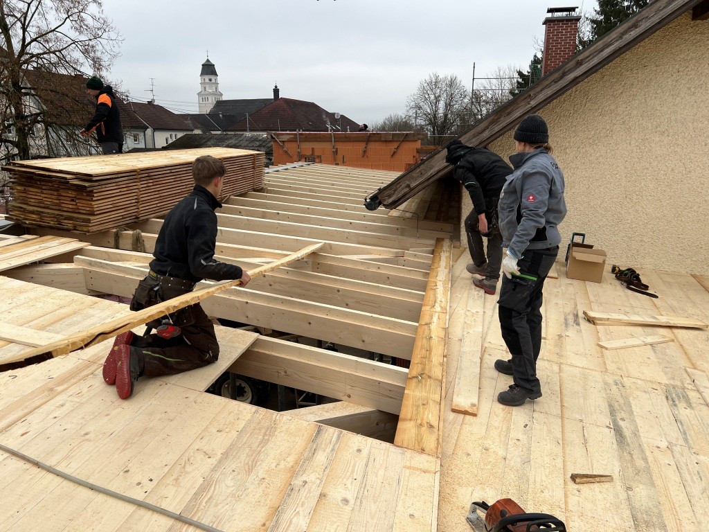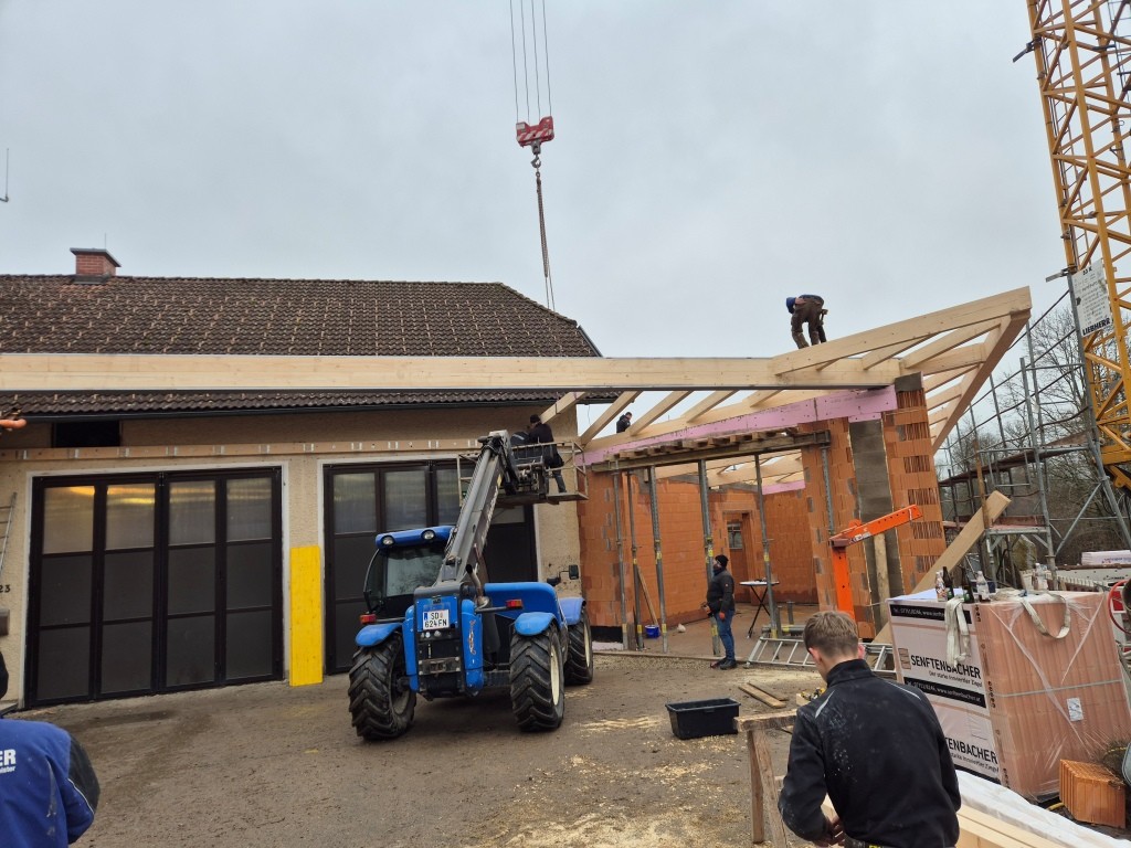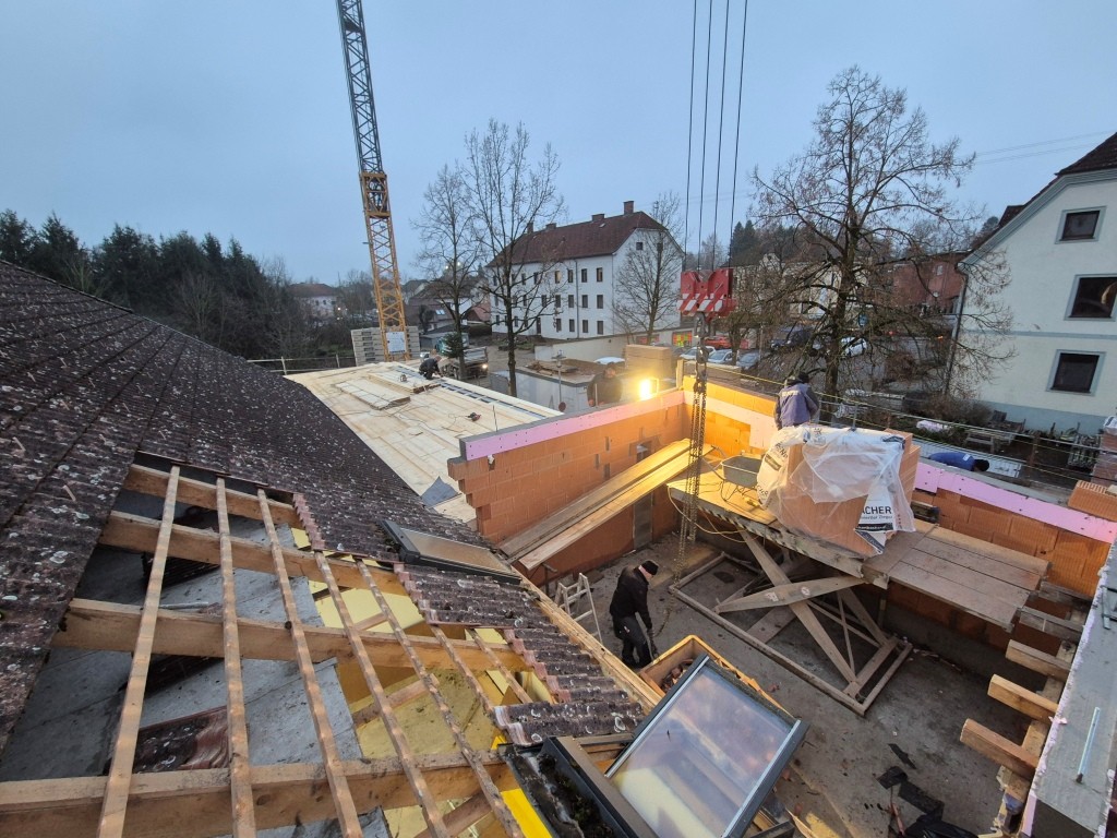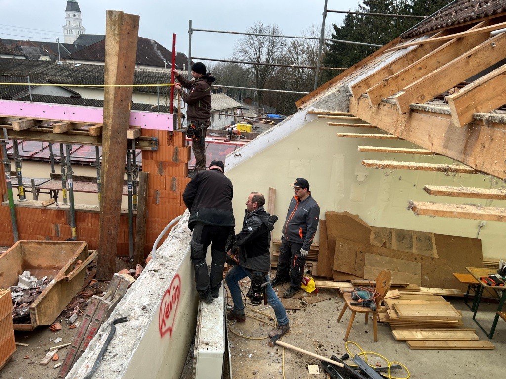 Nach dem Abbinden des Dachstuhls wurde dieser auch in kameradschaftlicher Eigenleistung durch die Feuerwehr in 4 Arbeitstagen in der darauffolgenden Woche gestellt. Neben den Arbeiten am Dach wurden auch noch diverse Durchbrüche und Abrissarbeiten durchgeführt. Zahlreiche Türen, Fenster und Durchgänge wurden gestemmt. Auch im Schulungsraum wurde die westliche Wand herausgenommen um dort die neue Verlängerung des Daches anzubringen.