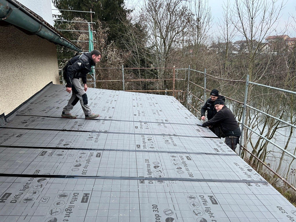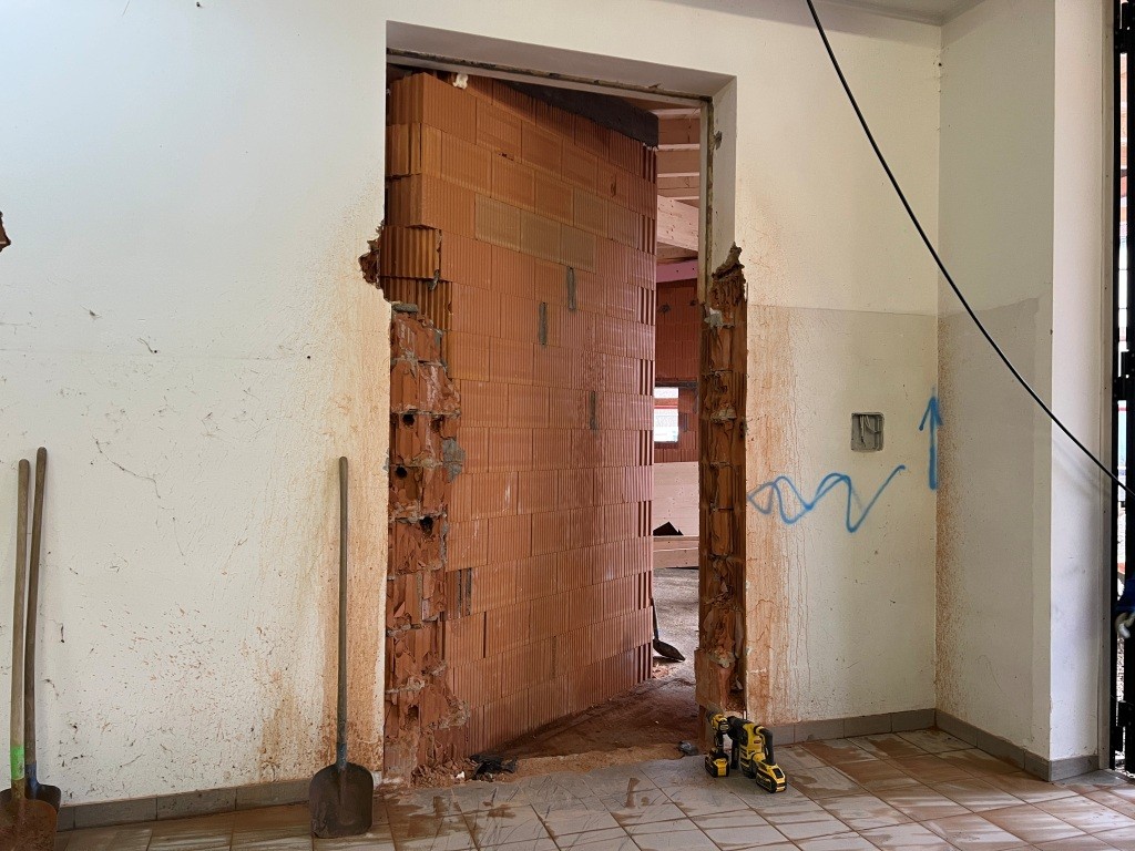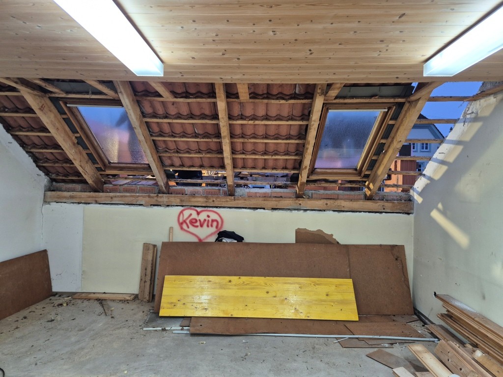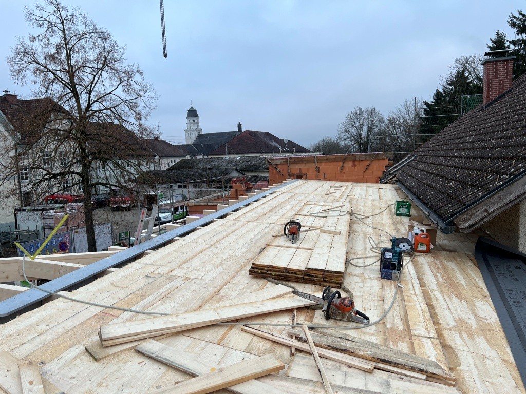 Nach dem Abbinden des Dachstuhls wurde dieser auch in kameradschaftlicher Eigenleistung durch die Feuerwehr in 4 Arbeitstagen in der darauffolgenden Woche gestellt. Neben den Arbeiten am Dach wurden auch noch diverse Durchbrüche und Abrissarbeiten durchgeführt. Zahlreiche Türen, Fenster und Durchgänge wurden gestemmt. Auch im Schulungsraum wurde die westliche Wand herausgenommen um dort die neue Verlängerung des Daches anzubringen.
