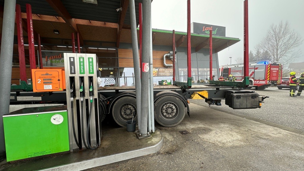 Einsatzgrund war ein LKW, welcher beim Wenden auf der Tankstelle aufgrund seiner Größe zahlreiche Gegenstände streifte und beinahe das Dach der Tankstelle einriss. Glücklicherweise konnte der Fahrer noch angehalten werden bevor noch größerer Schaden entstand. Nach dem Eintreffen der Feuerwehr wurde unter Leitung der Polizei das Fahrzeug durch den Fahrer behutsam zurückgesetzt. So konnte weiterer Schaden verhindert werden. Einsatzende gegen 13:30 Uhr im Feuerwehrhaus.